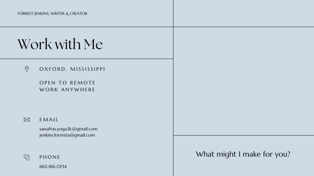 I’m Forrest, a yoga instructor and market research analyst living in Northeast Mississippi. I started this blog in order to make a space to share some of the practices that are most important to my life. I have placed my yoga practice, and the sharing of yoga with others, at the front of my life, because it is the primary and most effective tool I use to maintain my health–physical, mental, and emotional. I hope to share helpful information and resources about personal health and wellness, and ways that I build sustainable nurture and care into my own daily life. I hope you find something here that nourishes you!